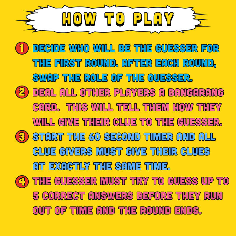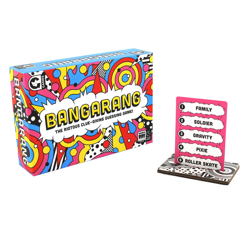 Get ready for a wild ride of laughter, creativity, and teamwork with BANGARANG, the fun family game that takes clue-giving to a whole new level! In this high-energy game, players join forces to help the guesser unravel the mystery word on the card using a variety of entertaining clues.